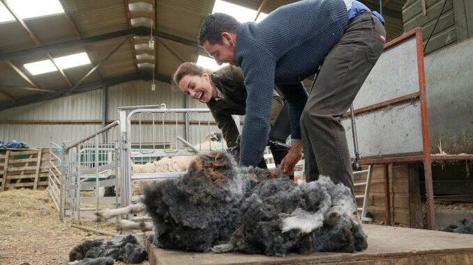 Kate și William au vizitat o fermă de animale, unde cei doi și-au testat abilitățile de crescători de oi. Ducii de Cambridge au pus mâinile pe mașina de tuns și, încurajați de fermieri, au tuns câte o oaie, sub supravegherea localnicilor.