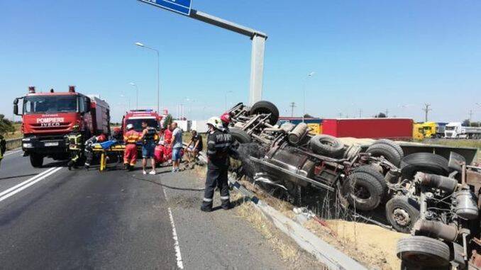 Din primele informații, se pare că victima, șoferul camionului, este conștientă, iar autotrenul încărcat cu cereale este răsturnat în afara părții carosabile. În urma răsturnării, TIR-ul a început să aibă scurgeri de carburant, informează Glasul Aradului.