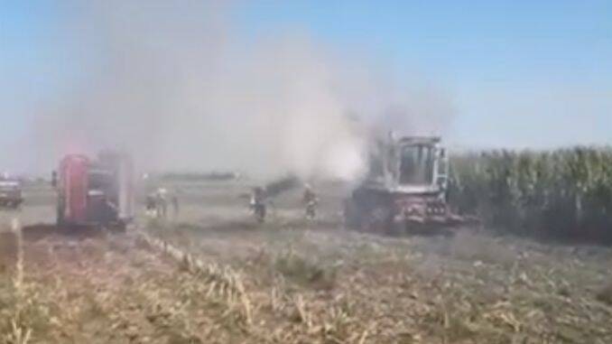 Combină agricolă, cuprinsă de flăcări în timp ce recolta porumbul