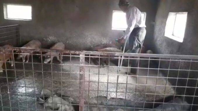 Situația dificilă în care se află un crescător de animale infirm și cu șapte copii! Mihai Viloi, în vârstă de 43 de ani, din comuna Roșia, județul Sibiu, crește porci de când avea 8 ani de zile și spune că acest lucru reprezintă pentru el mai mult decât o afacere și că nu ar renunța la această îndeletnicire pentru nimic în lume, ca drept dovadă că nici faptul că a rămas fără un picior nu l-a oprit să mai crească porci.
