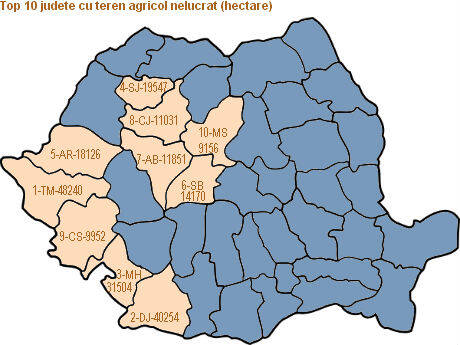 Pe primul loc în clasament se află Timiş – unul dintre judeţele care au atras cei mai mulţi investitori străini – cu o suprafaţă de 48.240 de hectare de teren agricol nelucrat, urmat de Dolj – 40.254 hectare şi Mehedinţi – 31.504 hectare.