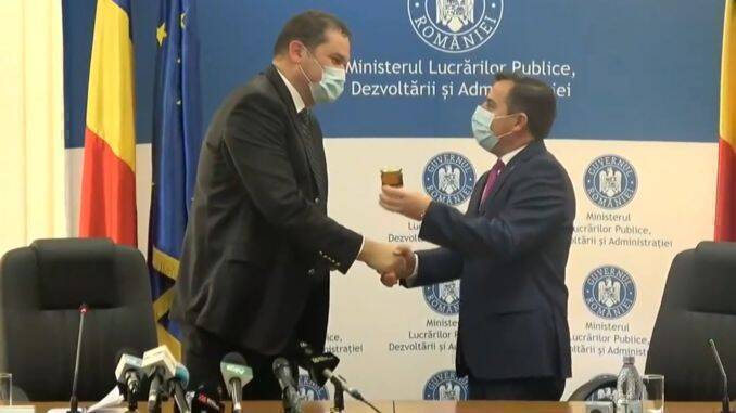 Cadoul inedit, un borcan cu miere de salcâm, a fost făcut de fostul ministru al Dezvoltării, Lucrărilor Publice şi Administraţiei, Ion Ștefan, pentru noul ministru, Cseke Attila, astăzi, luni – 28 decembrie 2020, la preluarea mandatului.