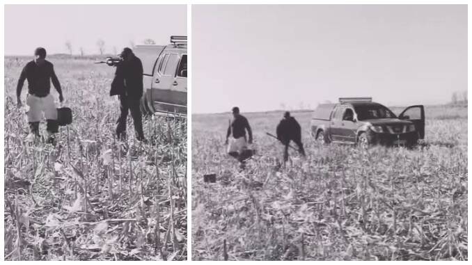 Scenele incredibile au fost surprinse chiar pe câmp, departe de ochii lumii. Din imaginile surprinse de persoanele amenințate, vânătorului pare să nu îi pese deloc dacă pățește ceva sau nu. Scandalul a început după ce agricultorii au venit pe câmp să își strângă porumbul, iar vânătorul s-a simțit deranjat că nu poate vâna în liniște.