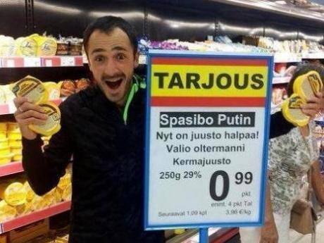Pentru a semnala ofertele speciale și ieftinirea mâncării de la raft, reprezentanții hypermarketurilor finlandeze au pus plăcuțe cu mesajul ”Spasibo Putin!” (Mulțumim, Putin!), spre bucuria clienților care se și pozează cu acestea și cu produsele cumpărate.
