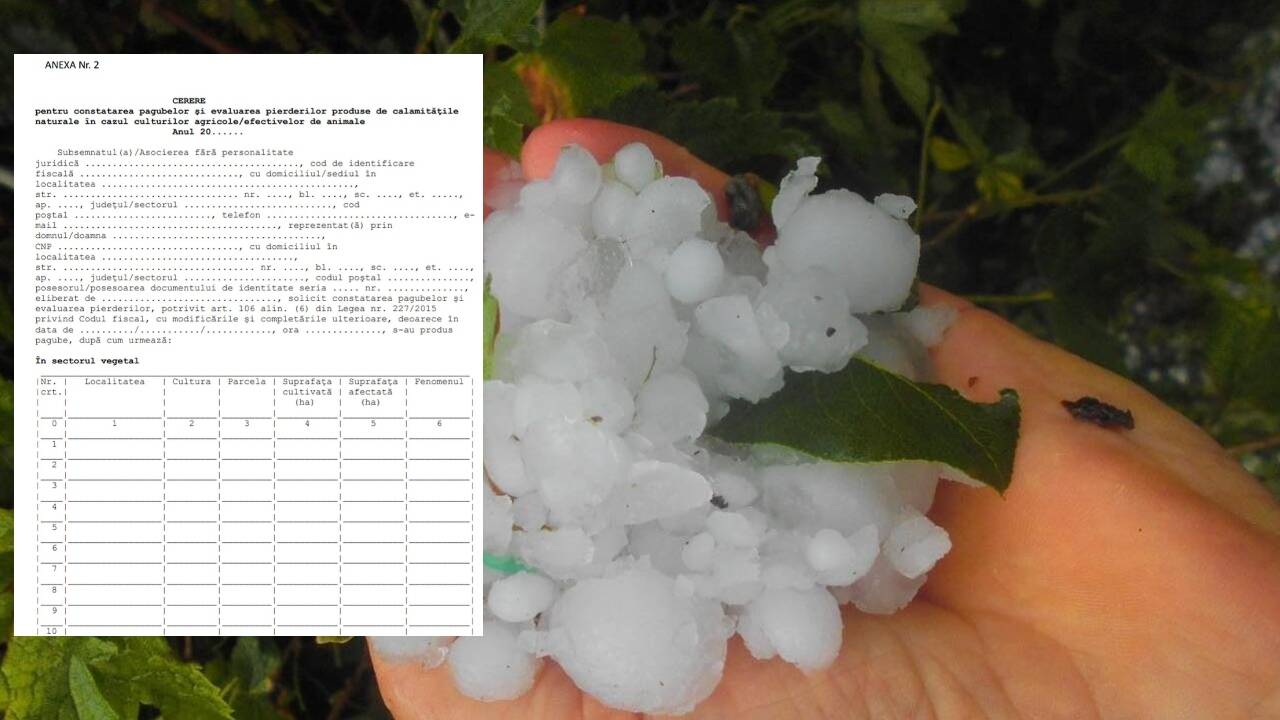 Model de înștiințare pentru fermierii care au culturile afectate de fenomene extreme și notifică primăriile în vederea întocmirii unei comisii de evaluare a pierderilor. Direcțiile Agricole au reamintit autorităților locale care este procedura ce trebuie urmată în cazul suprafețelor afectate de grindină, vijelie, ploi abundente/torențiale sau inundații.