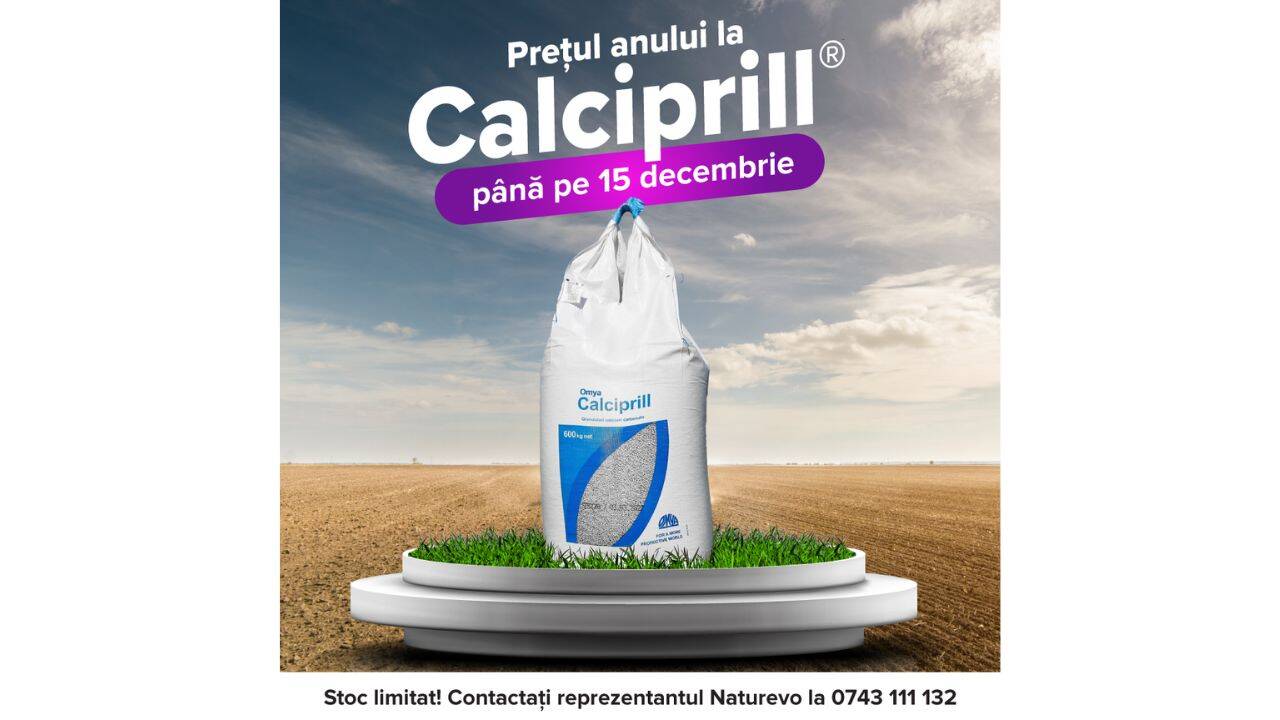 Compania Naturevo a lansat o super-ofertă pentru un stoc limitat de Calciprill. Până pe 15 decembrie, fermierii pot beneficia de prețul anului la produsul vedetă de la Omya, comercializat exclusiv în România prin Naturevo.