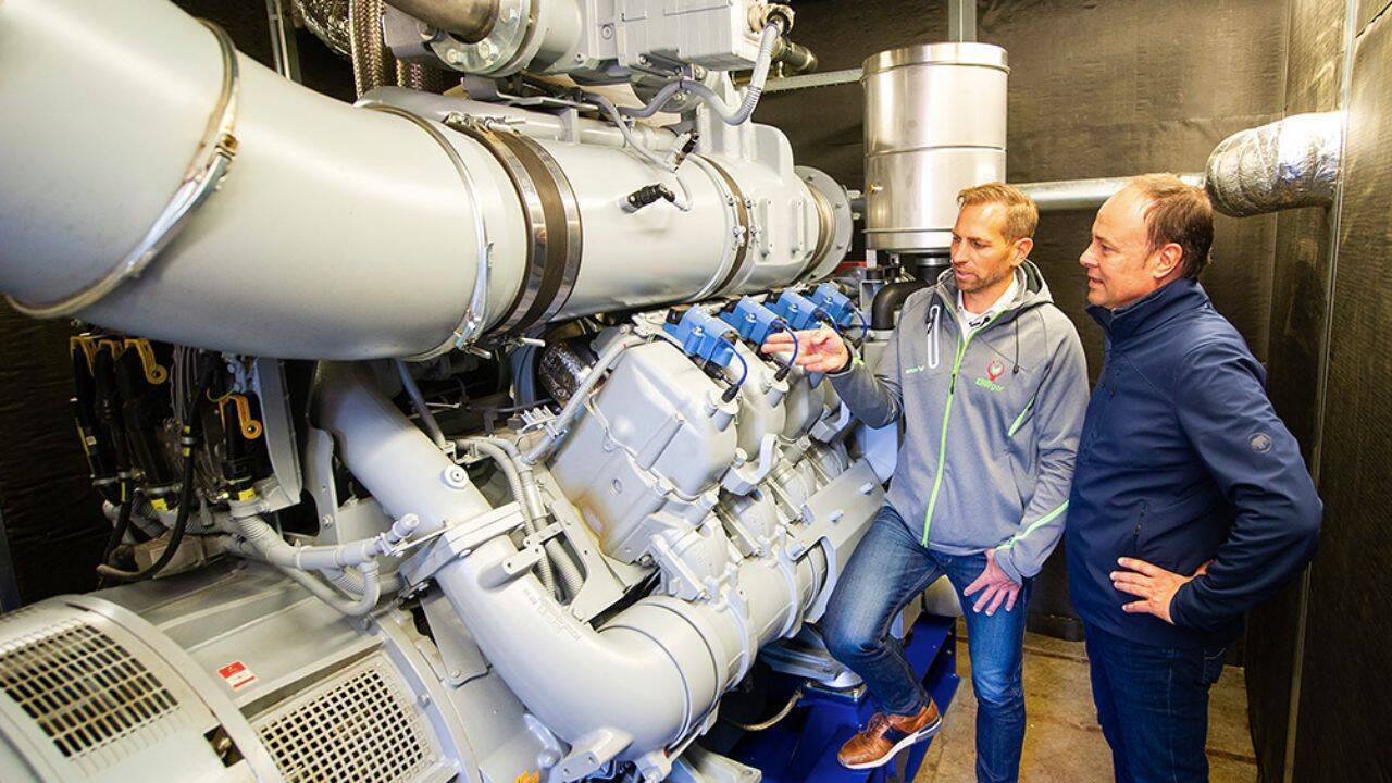 Biogazul este folosit, ulterior, la producția de energie, care are loc la ferma germană cu ajutorul a două motoare Rolls-Royce MTU 8V 4000 GS CHP. Sunt două motoare de mari dimensiuni V8, capabile să funcţioneze pe biogaz, cu generator electric ataşat în construcţie, dar şi cu trei surse de captare a căldurii — cea din motor, captată din sistemul de răcire al motorului, cea de la colectoare şi eşapament, la 120 grade Celsius, şi cea de 58 grade, din galeria de admisie. Un asemenea motor V8 are 4,77 litri cilindree per cilindru, sau 38,16 litri pentru întregul motor şi poate genera peste 1.300 CP putere. Aspectul important este că se generează electricitate şi căldură. Se poate produce 1.013 kW de electricitate, 604 kW de căldură din prima sursă, 480 kW de căldură din a doua sursă de la eşapament şi 51 kW de căldură din admisie. În total, producţia sumară îi asigură un randament de 90%, datorită faptului că se colectează atât electricitatea, cât şi căldura.
