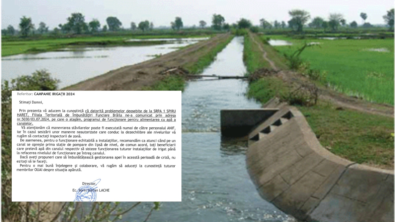 ”Prin prezenta vă aducem la cunoștință că datorită problemelor deosebite de la SRPA 1 SPIRU HARET, Filiala Teritorială de Îmbunătăţiri Funciare Brăila ne-a comunicat prin adresa nr.5030/03.07.2024, pe care o atașăm, programul de funcționare pentru alimentarea cu apă a canalelor. Vă atenţionăm că manevrarea stăvilarelor poate fi executată numai de către personalul ANIF, iar în cazul sesizării unor manevre neautorizate care conduc la dezechilibre ale nivelurilor vă rugăm să contactați inspectorii de zonă. De asemenea, pentru o funcționare echitabilă a instalațiilor, recomandăm ca atunci când pe un canal se oprește prima stație de pompare din lipsă de nivel, de comun acord, toți beneficiarii care prelevă apă din canalul respectiv să sisteze funcţionarea tuturor instalațiilor de irigat până la refacerea nivelului de funcționare pe întreg canalul. Dacă aveţi propuneri care să îmbunătățească gestionarea apei în această perioadă de criză, nu ezitați să le faceți. Pentru o mai bună înțelegere şi colaborare, vă rugăm să aduceți la cunostință tuturor membrilor OUAI despre situația apărută”, se arată în înștiințarea transmisă celor care au contract pentru irigații în județele Ialomița și Brăila.