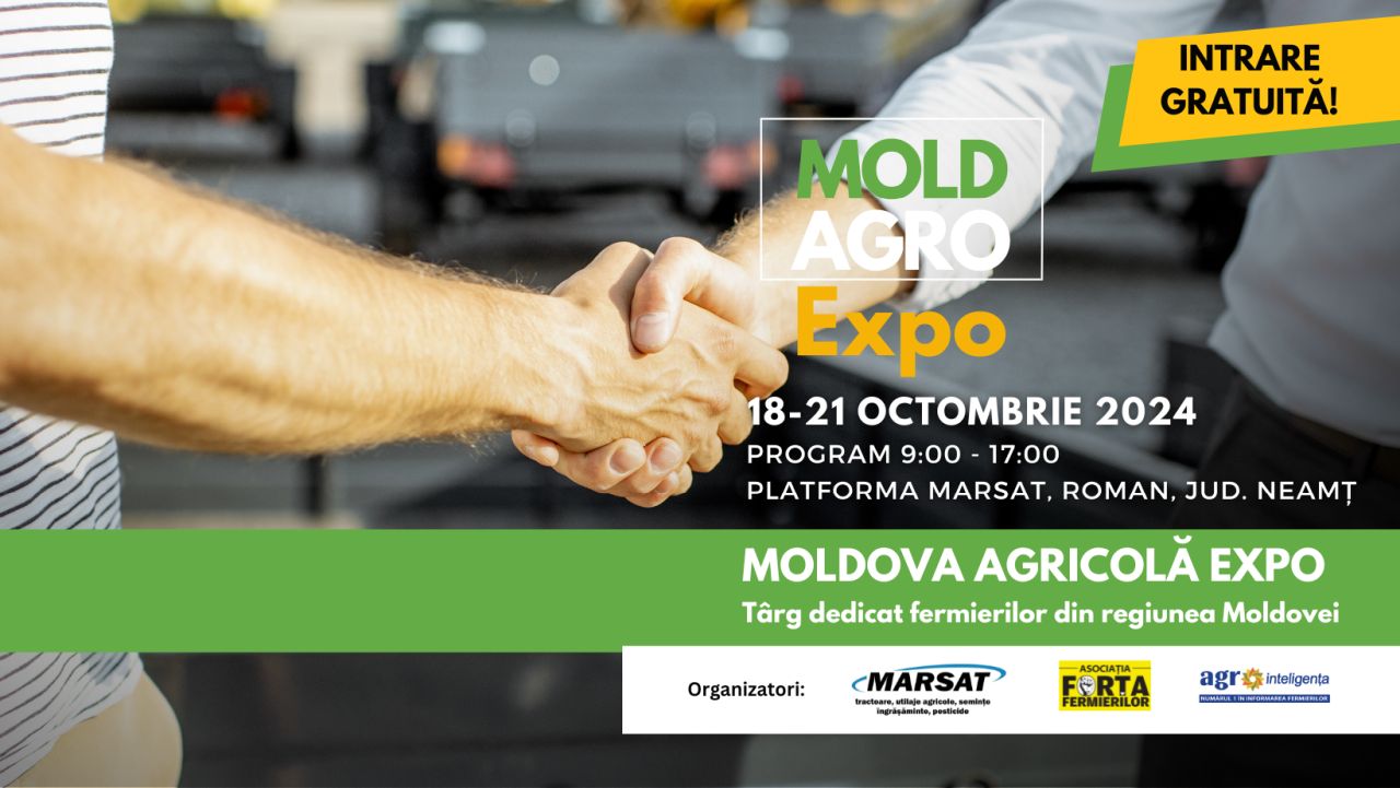 MoldAgro Expo – Moldova Agricolă Târgul Fermierilor, cea de-a doua ediție, este organizat în acest sfârșit de săptămână la Roman, județul Neamț! De vineri, 18 octombrie, până luni, 21 octombrie, inclusiv, fermierii sunt invitați la Roman, pe platforma Marsat (strada Ștefan cel Mare, nr. 276), să afle care sunt ofertele toamnei și soluțiile inovatoare pentru afacerile lor. Deschiderea oficială a târgului va avea loc vineri, 18 octombrie, de la ora 10:00, fiind urmată de Congresul Fermierilor 2024. Programul de vizitare zilnică a târgului este 9:00 – 17:00, cu intrare liberă.