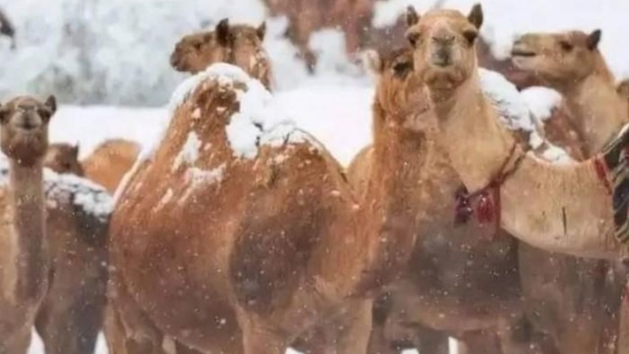 O caravană de cămile poate fi văzută călcând cu prudență pe stratul de gheață care s-a format deasupra nisipului, iar oamenii au coborât din mașini pentru a vedea zăpada pentru prima dată.