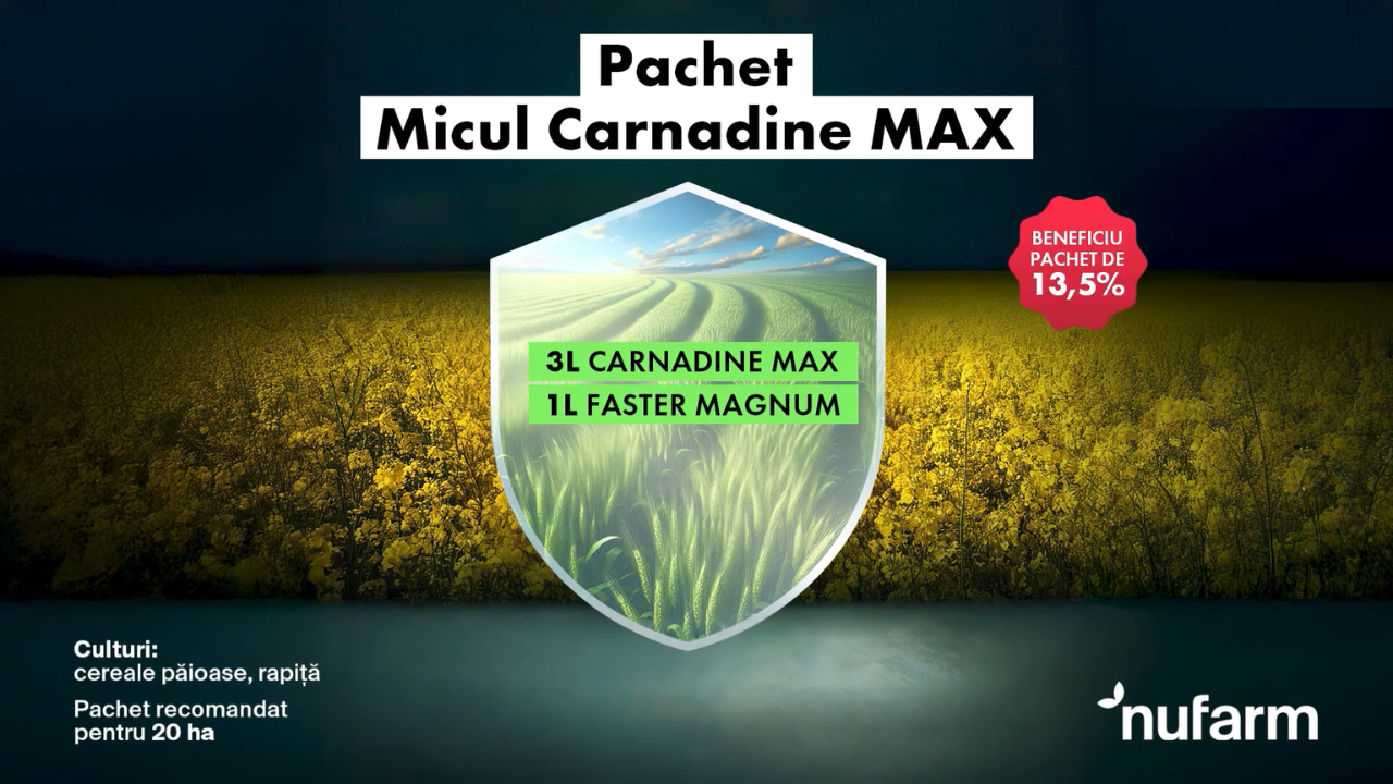 Pachetul Micul Carnadine Max de la Nufarm este soluția inteligentă pentru fermierii care își doresc protecție completă, eficiență de lungă durată și costuri optimizate. Acest pachet garantează o cultură sănătoasă, productivă și sigură, indiferent de provocările din câmp. Toate detaliile despre pachetul Micul Carnadine Max, dar și restul produselor din portofoliul Nufarm se găsesc pe www.nufarm.com/ro.