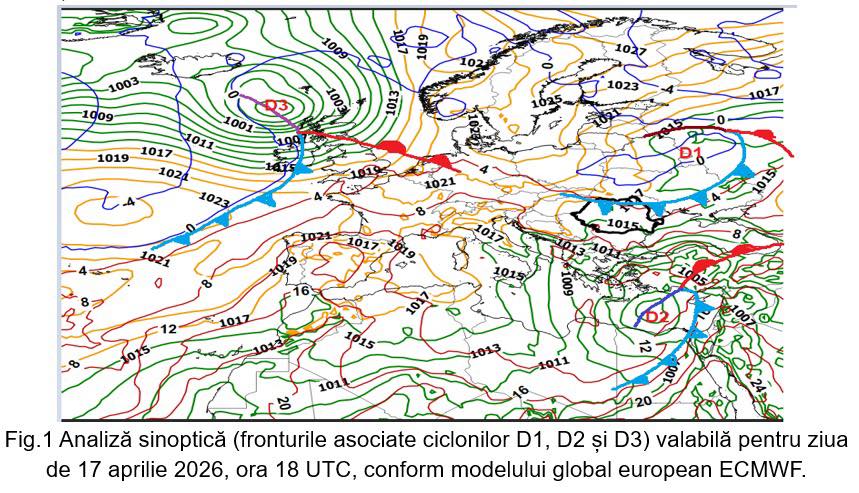 Până la finalul acestei săptămâni (18-19 aprilie), regimul termic va fi în general apropiat de mediile multianuale, astfel că cele mai ridicate temperaturi maxime, până în jurul a 20 de grade, sunt de așteptat în vestul și local în sudul țării. Pe parcursul zilei de vineri, 17 aprilie, un front atmosferic rece, aferent unui ciclon D1 (prezent în zona Câmpiei Ruse), fig.1, va traversa țara de la nord către sud și va determina perioade cu înnorări temporar accentuate, ploi mai ales sub formă de aversă (ce vor putea atinge izolat 20…30 l/mp), însoțite de descărcări electrice în nord, centru și nord-est, iar spre seară și noaptea în sud și sud-est.