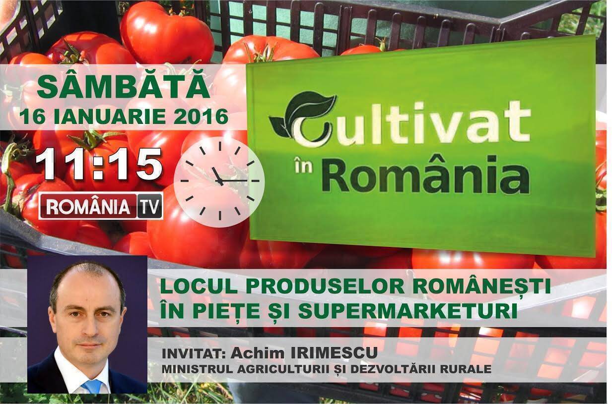 Sâmbătă, 16 ianuarie, invitatul emisiunii ”Cultivat în România” este ministrul agriculturii Achim Irimescu. Discuția va viza mai ales locul produselor românești în piețele și supermarketurile de la noi din țară, precum și ce se poate face pentru a sprijini industria agro-alimentară autohtonă.