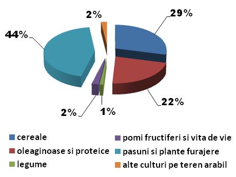 Anul trecut, cea mai mare pondere în totalul suprafeţelor au avut-o păşunile şi suprafeţele cu plante furajere – 44% din total (cca. 165.000 ha), urmate de cereale – 29% (130.000 ha), oleaginoase şi proteice 22%, (105.000 ha ). Suprafeţele cultivate cu pomi fructiferi, viţă de vie şi legume reprezintă 2%, respectiv 1%.