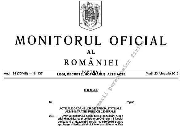 ”Ordinul subvențiilor pe 2016” a fost publicat în Monitorul Oficial (nr. 137), intrând astfel în vigoare începând de astăzi. Actul normativ are 15 pagini cu tot cu Anexe și include toate modificările pe care Ministerul Agriculturii le-a anunțat ca simplificări la depunerea cererii unice de plată aferentă anului agricol în curs (le puteți citi AICI)