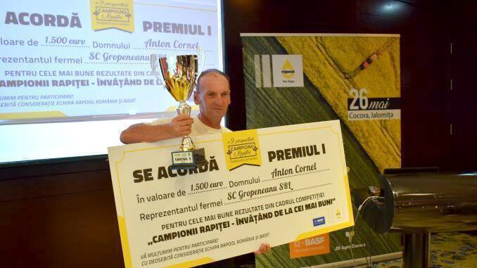 La ridicarea trofelui însoțit de un cec de 1.500 de euro, fermierul Anton Cornel a mulțumit organizatorilor competiției pentru cea mai profitabilă tehnologie de cultivare a rapiței. Câștigătorul s-a arătat surprins de locul întâi pe care l-a ocupat mai ales că treburile din fermă l-au făcut să sară peste una dintre fertilizările rapiței, cea pe care o avea programată pentru aprilie.